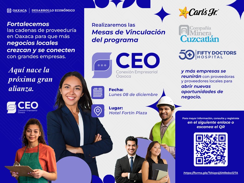 Oaxaca de Juárez, Oax. 2 de diciembre de 2025.- La Secretaría de Desarrollo Económico (Sedeco) invita a las Micro, pequeñas y medianas empresas (Mipymes), así como personas emprendedoras, a participar en las Mesas de Vinculación del programa Conexión Empresarial Oaxaca (CEO), que se realizarán el próximo 8 de diciembre a las 8:30 horas en el Hotel Fortín Plaza.